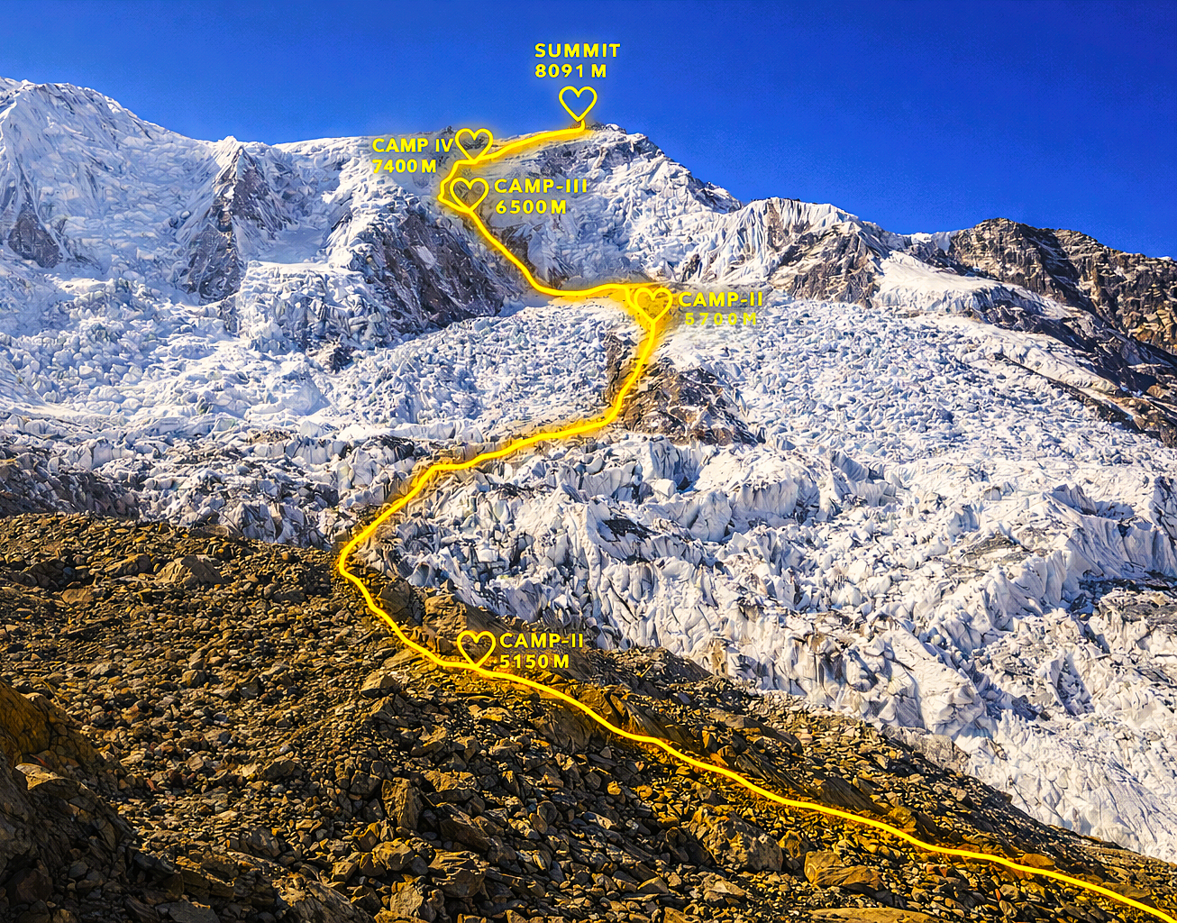 The terrain from Camp I to Camp II includes ice and mixed climbing sections. You will traverse steep blue ice portions and a 60-meter-high rock wall. Camp II is strategically placed above a snowy terrace for safety.