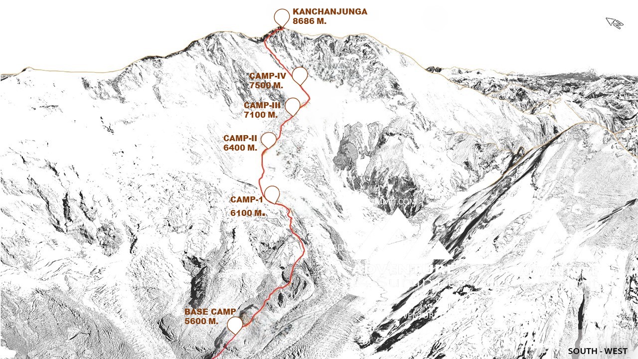 The moderately technical route on Mount Kanchenjunga, starts at the south face of the Yalung glacier, above the snowy terrace. At the center and bottom of the slope, there is Camp 2.